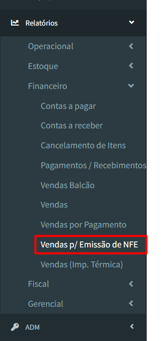 1º Passo: Acesse o Retaguarda, no menu lateral, clique em “Relatório”, depois em “Financeiro” e, por fim, em “Vendas p/ emissão de NFE”: