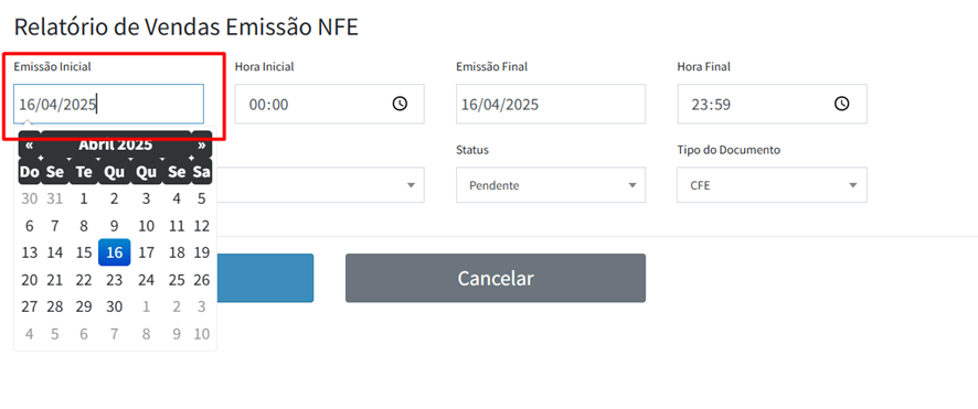 2º Passo: Selecione o período da venda, utilize o filtro “Emissão inicial” para colocar a data da primeira venda que deseja gerar a DANFE: