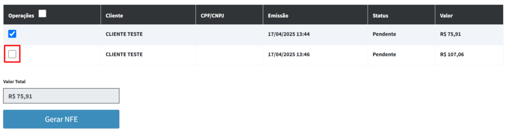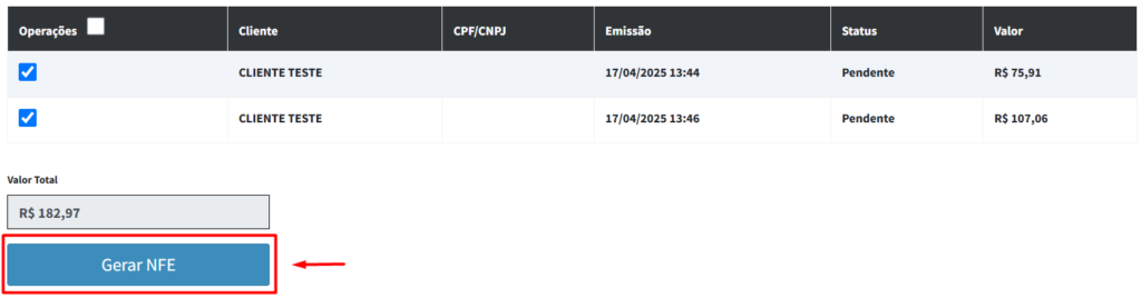 6º Passo: Gere a NFE, com as vendas selecionadas, clique no botão “Gerar NFE”: