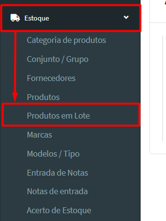1º passo: No “menu de navegação”, clique em “Estoque” > “Produtos em Lote”;