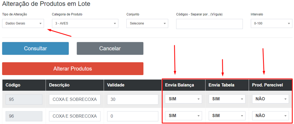 Ao escolher o item, “Dados Gerais”, clique no botão azul “Consultar”, tendo assim a possibilidade de alterar os espaços “Envia Balança”, “Envia Tabela” e “Produto Perecível”: