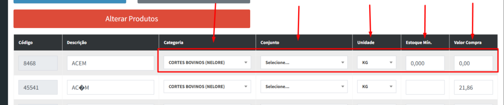 Observação: Após fazer a mudança de qualquer item, para o sistema gravar no nosso banco de dados, é necessário finalizar com o botão “Alterar Produtos”.