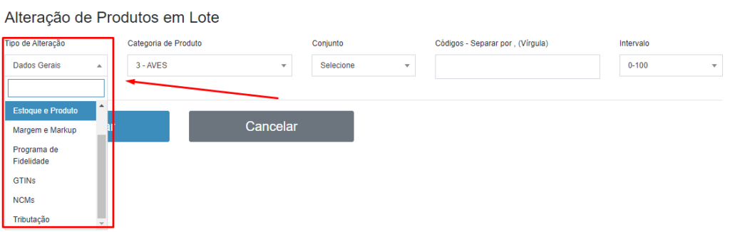 Nesse caso, ao invés de fazer a alteração de cada produto pela aba de “cadastros”, que demandaria um tempo maior, disponibilizamos a alteração por lote, tornando assim a troca mais rápida e eficiente.