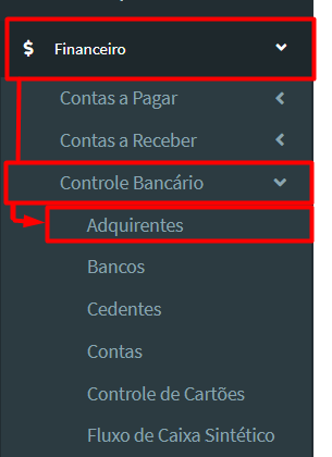 1º Passo: Na aba lateral “menu de navegação”, clique em “Financeiro” > “Controle Bancário” > “Adquirentes”: