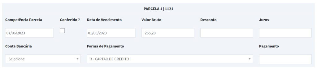 4° Passo: É importante que as informações das parcelas estejam corretas, caso, por exemplo a forma de pagamento estiver errada, ao dar baixa nessa conta, o comprovante vai apresentar a forma de pagamento presente na parcela: