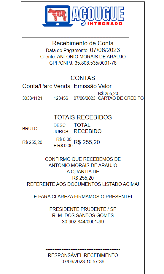 3° Passo: Ao selecionar a compra e clicar em "Baixar Contas", o comprovante que será emitido será o dá imagem abaixo: