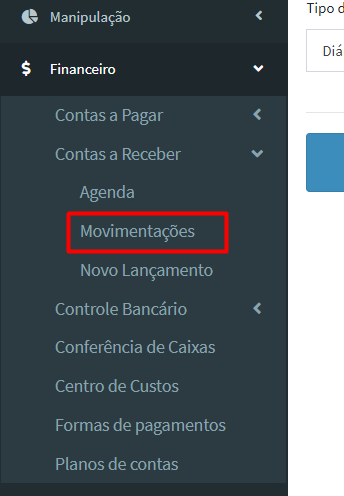 1º Passo: Na aba lateral “menu de navegação”, clique em “Financeiro” > “Contas a Receber” > “Movimentações”: