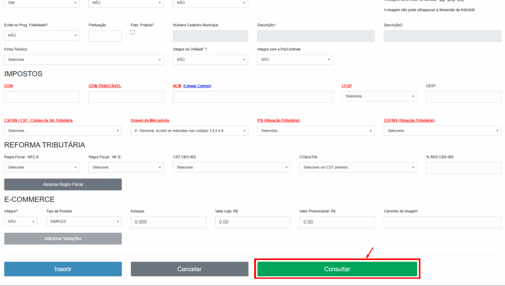 2º Passo: Dentro da tela de cadastro de produto, pressione a tecla F2 para abrir a aba de consultar produtos ou role a tela para baixo e clique em CONSULTAR