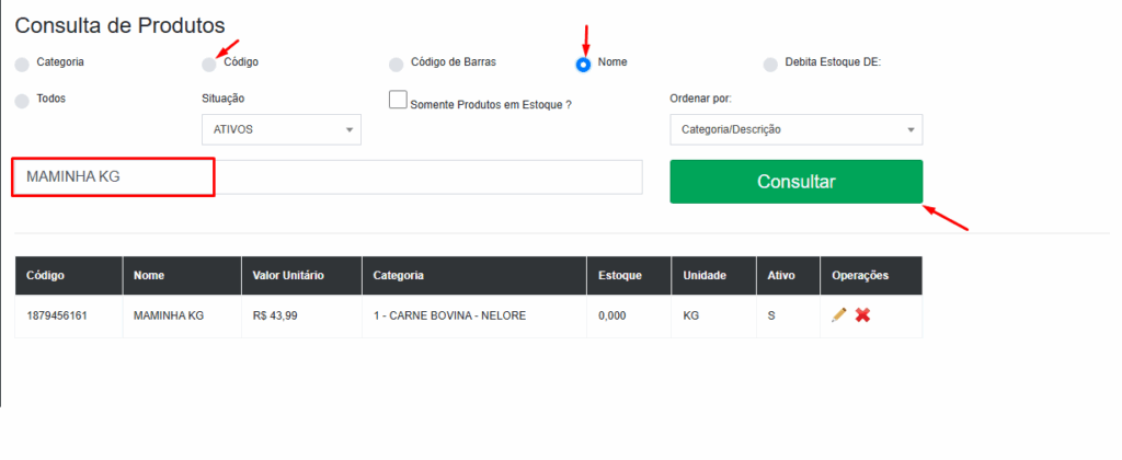 3º Passo — Na aba de consulta, você seleciona o filtro 'Nome' ou 'Codigo' e insere o descritivo, clique em Consultar.