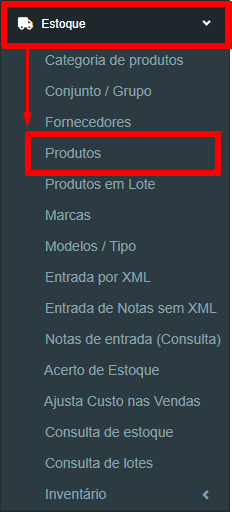 1º Passo: Na aba lateral “menu de navegação”, clique em “Estoque > Produtos”