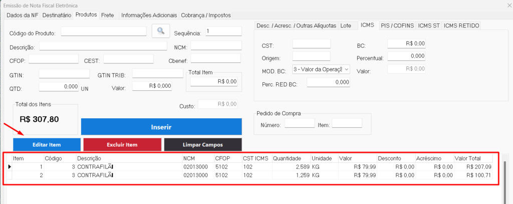 6º Passo: Na aba 'Produtos', também serão preenchidos automaticamente os produtos inclusos no cupom fiscal, basta realizar a conferência dos itens e clicar em 'Editar Item' se desejar alterar algo. Lembre-se de verificar todas as tributações com o auxílio do seu contador!