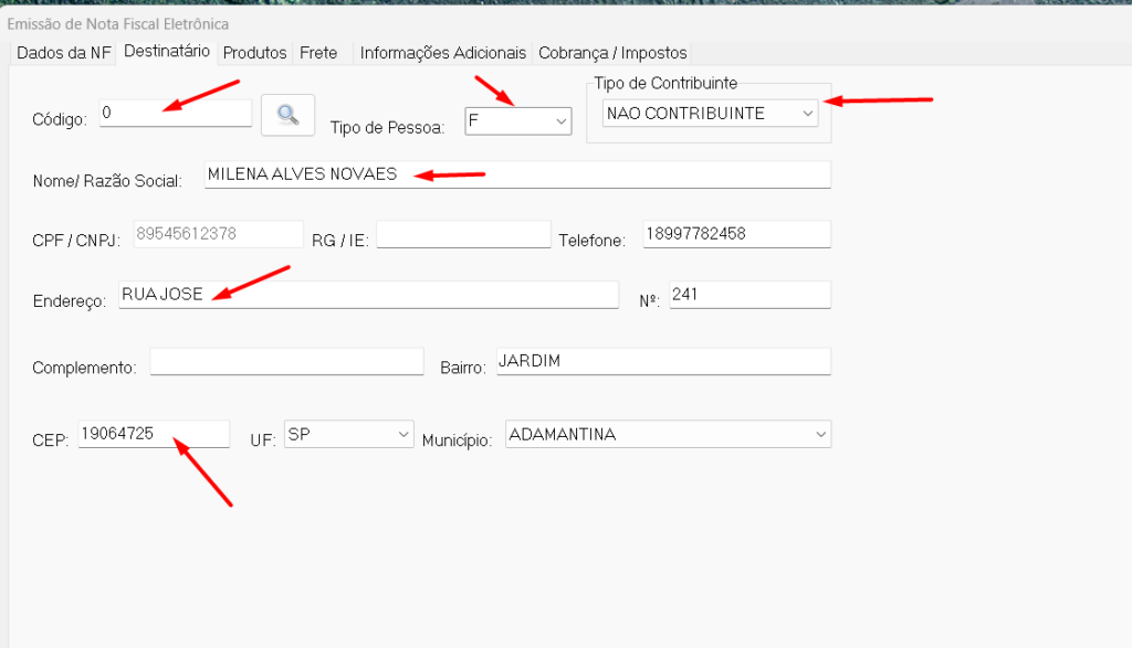 5° Passo: Na aba 'Destinatário', as informações já serão preenchidas de acordo com o cliente informado na venda. Basta conferir se está tudo correto e preenchido conforme o obrigatório.