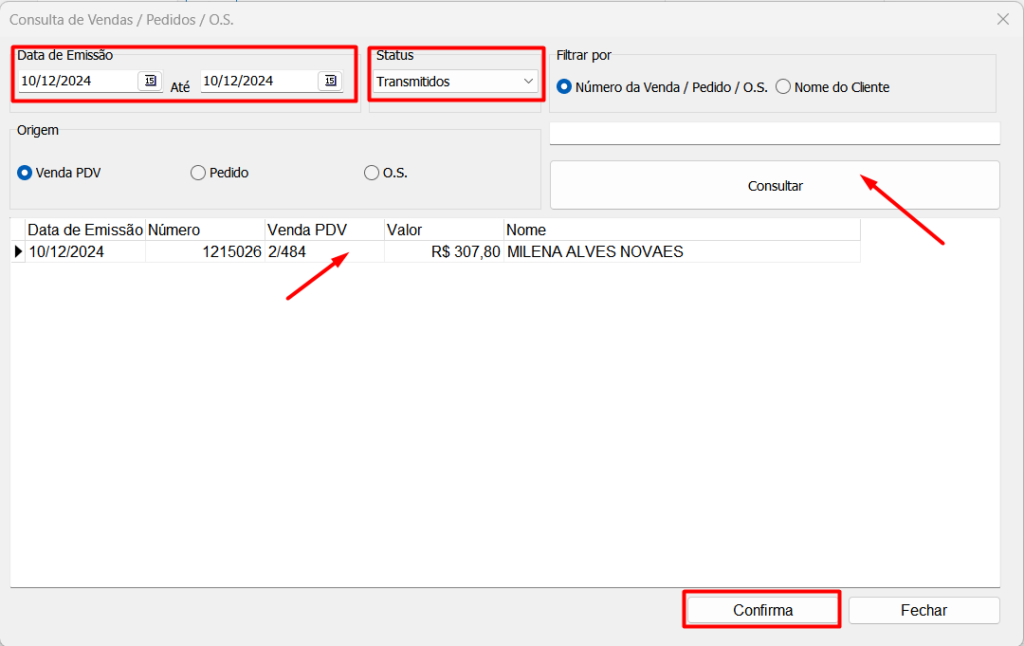 3º Passo: Localize a venda a partir de sua data e status. Ao localizar, basta um clique sobre a venda e clicar em 'Confirmar' para puxar as informações ao emissor.
