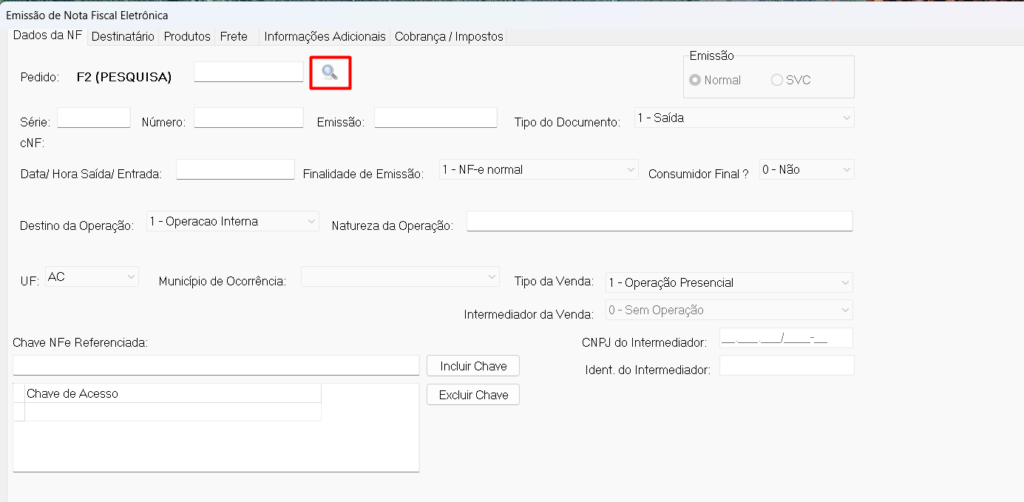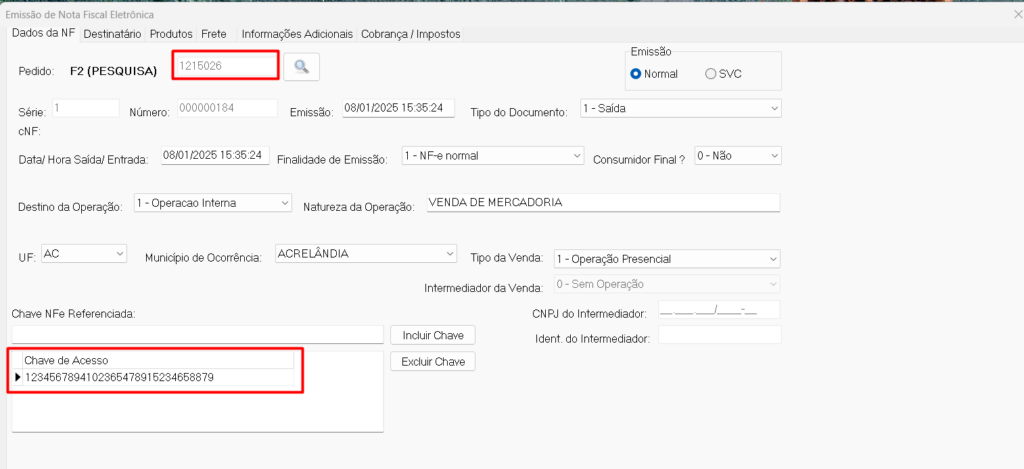 4º Passo: Feito isso, confira as informações puxadas da venda, incluindo a chave de acesso da nota que será preenchida automaticamente.
