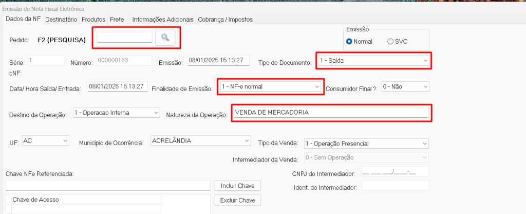 Os campos destacados nesta mesma imagem, “Tipo de documento”, “finalidade de Emissão” e “Natureza da Operação”, são campos fixos, não os altere!