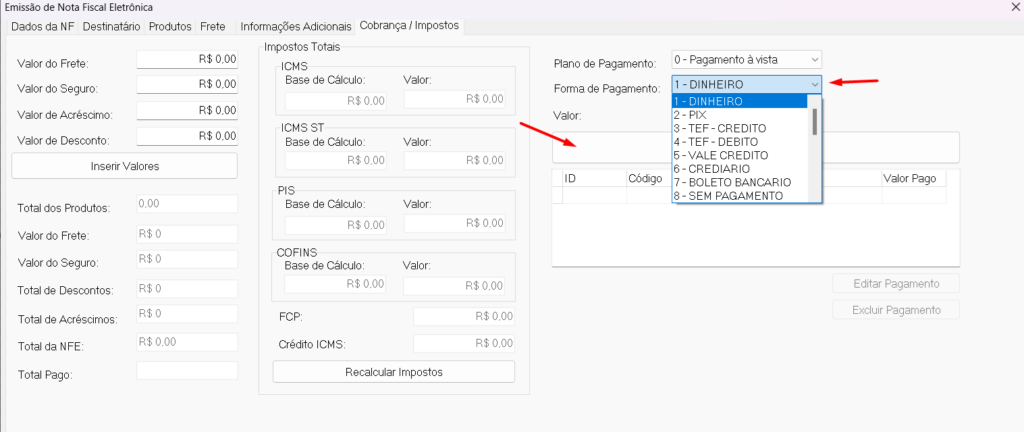 Observação: Em "Plano de pagamento", opção "nenhum" e "Forma de Pagamento", opção "Sem Pagamento" são selecionados somente no caso de emissão de nota de devolução.