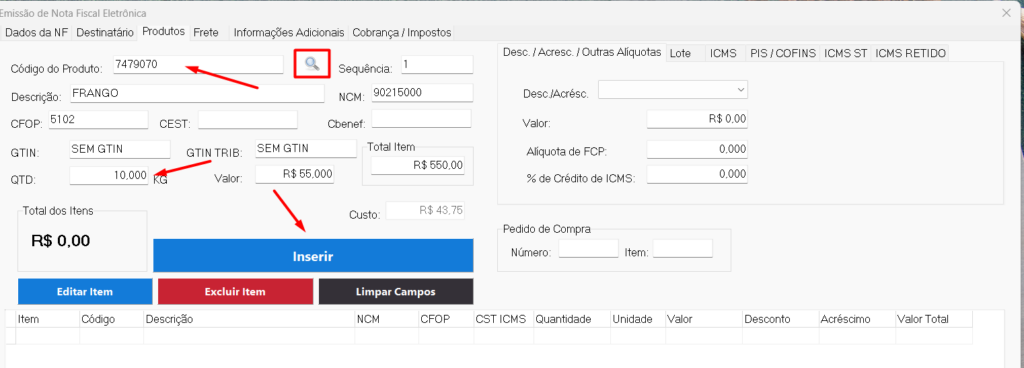 5° Passo: Logo após o destinatário vamos para a aba "Produtos", pesquise o código do produto, clique em F2 no seu teclado, onde todas as informações posteriores serão preenchidas.