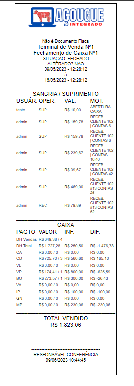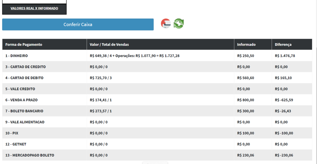 8° Passo: Dentro de "Valores Real X Informado", poderá visualizar o seu fechamento de caixa, ou seja, o que foi vendido e o que foi informado pelo atendente que realizou aquele fechamento e o sistema irá apresentar a diferença: