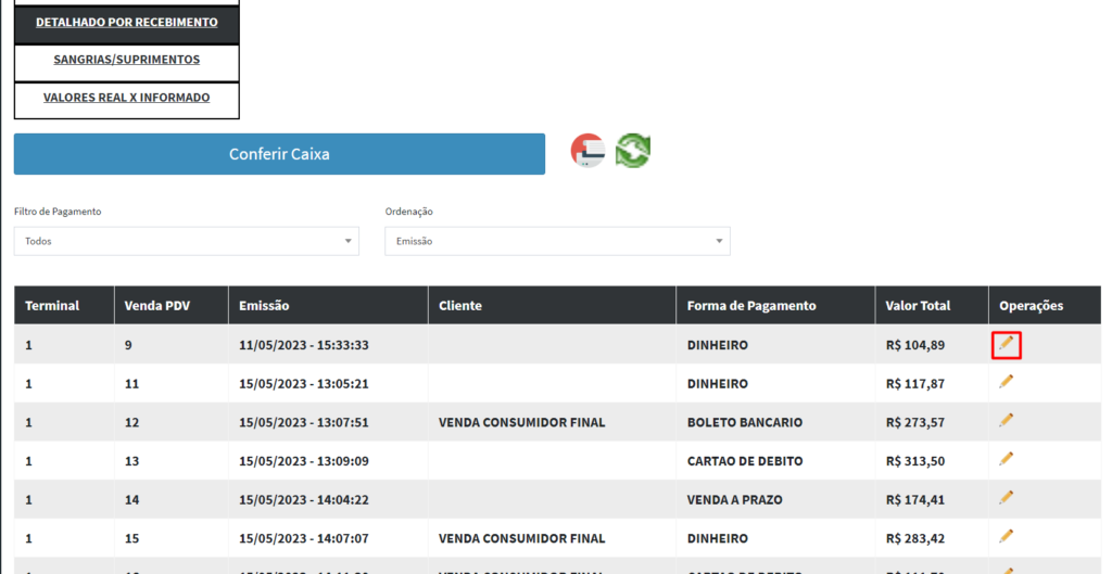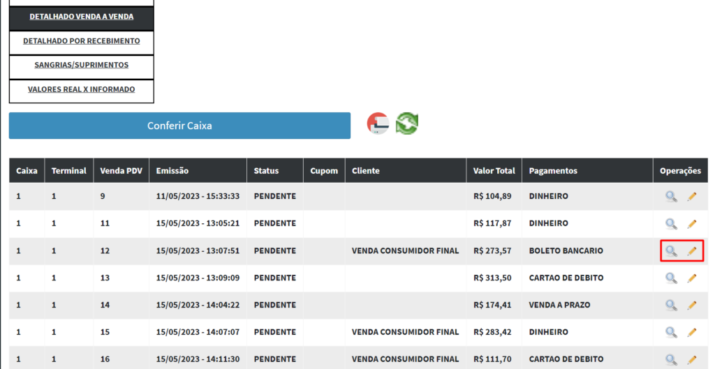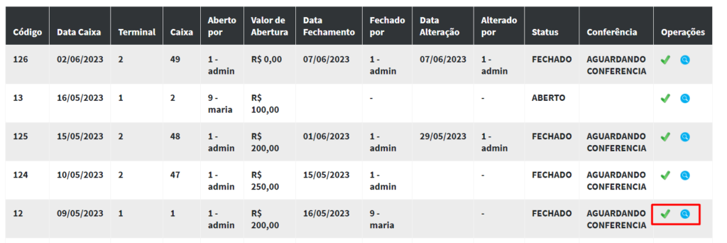 3° Passo: Localize o caixa que deseja conferir e clique no símbolo verde e caso queira visualizar a notinha de fechamento de caixa clique na lupa: