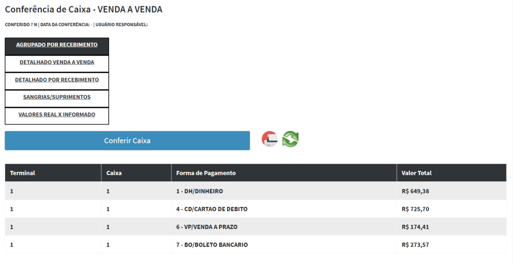 4° Passo: Dentro da tela de conferência de caixa verá que tem 5 maneiras de visualizar o seu caixa e realizar a conferência, sendo elas, "Agrupado por Recebimento", "Detalhado Venda a Venda", "Detalhado por Recebimento", "Sangria/Suprimento" e "Valores Reais X Informado".