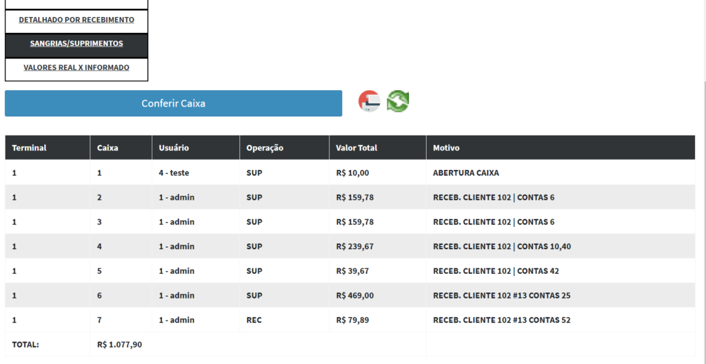 7° Passo: Dentro de "Sangrias/Suprimento", poderá visualizar tudo que entrou e saiu do seu caixa e logo no fim o total, nessa tela não há opção de alterar: