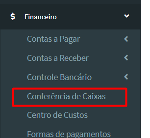 1º Passo: Na aba lateral “Menu de Navegação”, clique em “Financeiro” > “Conferência de Caixa”: