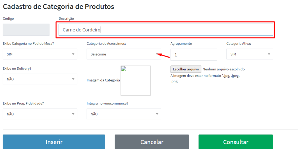 Insira o nome da sua categoria e se necessário selecione uma categoria de acréscimo: