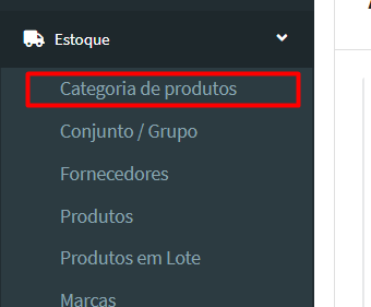 1º Passo: Na aba lateral “menu de navegação”, clique em “Estoque” > “Categoria de produtos”: