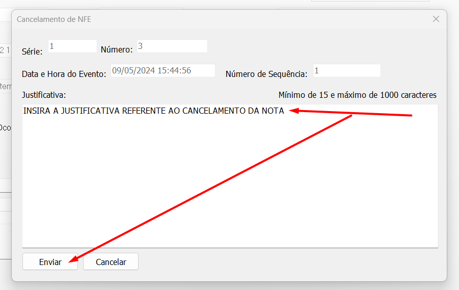 4º Passo: Ao clicar no botão será exibida a tela para que seja inserida a justificativa referente ao cancelamento, essa justificativa será enviada diretamente a SEFAZ!. Após inserir a justificativa clique em "Enviar":