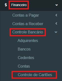 1º Passo: Na aba lateral “menu de navegação”, clique em “Financeiro” > “Controle Bancário” > “Controle de Cartões”:
