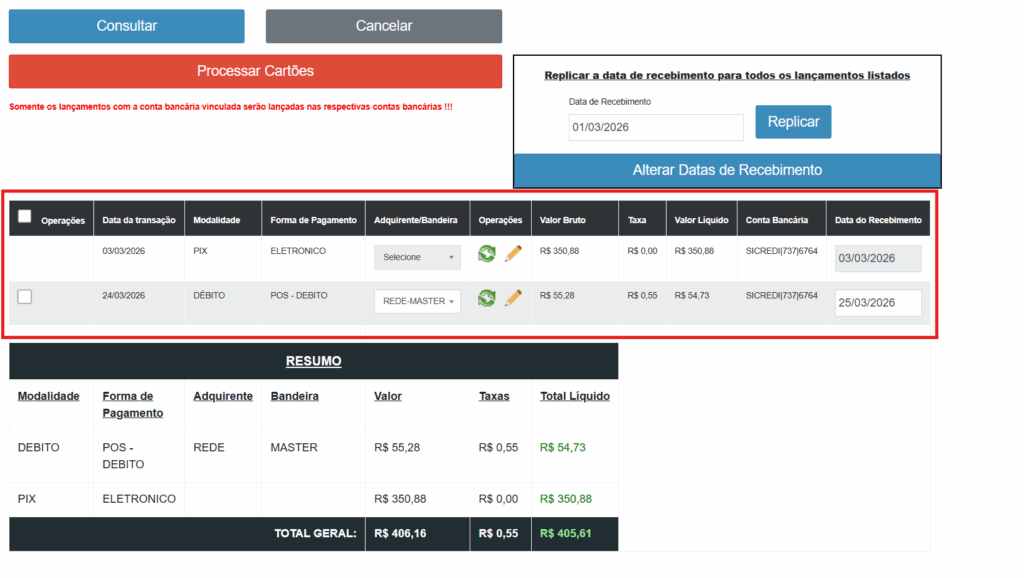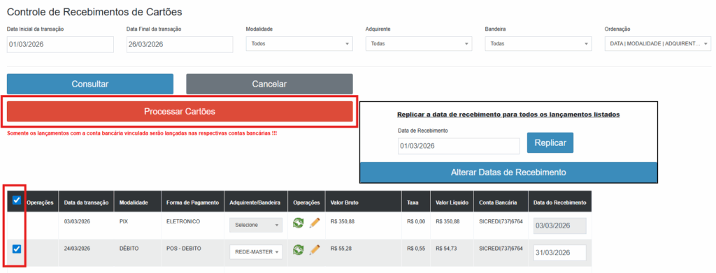 7° Passo: Por fim, selecione os cartões, os quais deseja processá-los. Para fazer isso é só marcar a caixa localizada no canto esquerdo da tabela, sendo possível selecionar manualmente os cartões que deseja fazer esse processo, ou clicar na primeira caixa no topo da tabela para selecionar todos de uma vez.