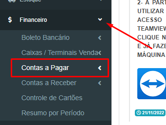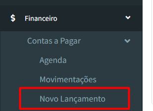1º Passo: Na aba lateral “menu de navegação”, clique em “Financeiro” aonde iremos selecionar a caixa “Contas a Pagar”: