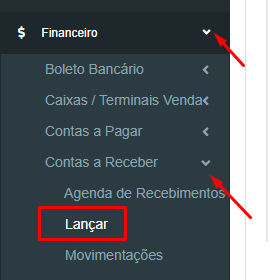 1º Passo: Na aba lateral “menu de navegação”, clique em “Financeiro” aonde iremos selecionar a caixa “Contas a Receber” e “Lançar”:
