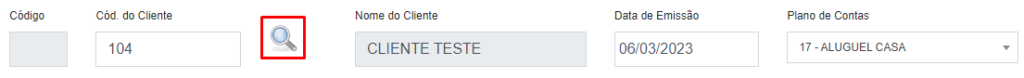 2º Passo: Dentro da página de lançamento de contas a receber vamos iniciar o preenchimento das primeiras lacunas (processo muito semelhante ao processo de lançamento de contas a pagar) onde você primeiro insere o código do cliente ou pesquisa na lupa.