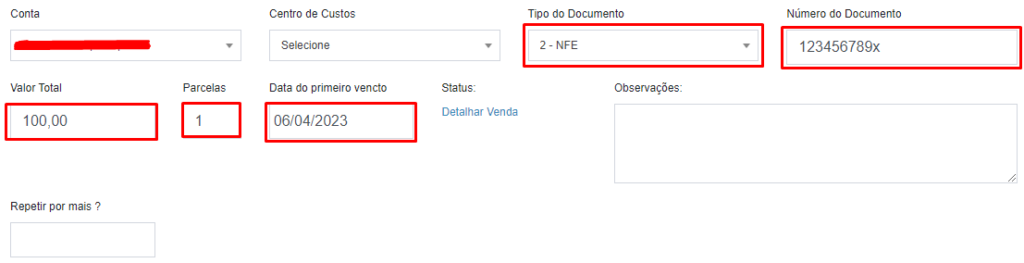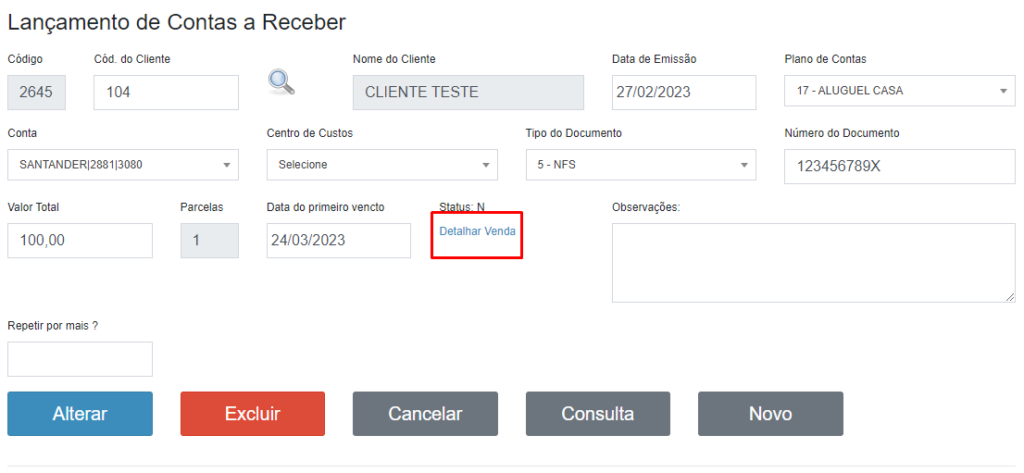 5º Passo: Caso queira detalhar mais sobre o lançamento, clique em "detalhar venda":