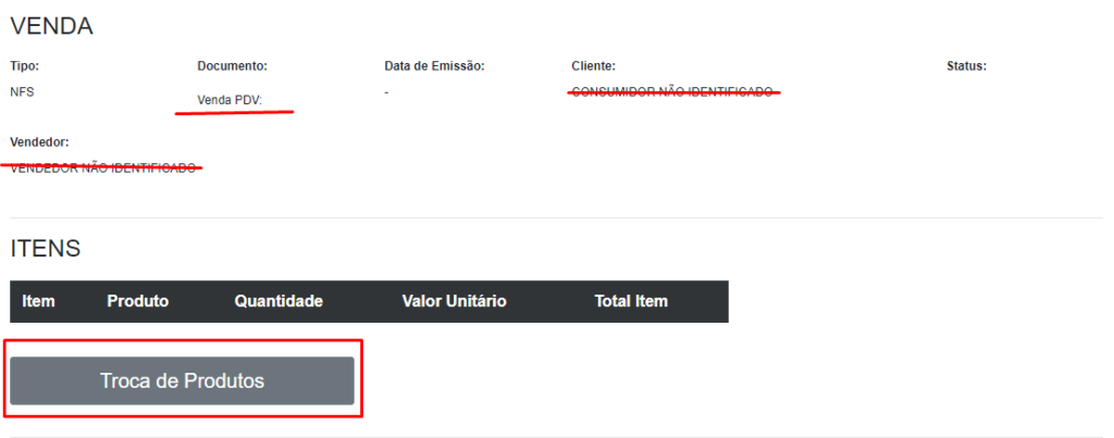 6º Passo: Ao clicar em "detalhar venda", vão abrir os dados do PDV referente a venda e deixará em aberto a opção de realizar a troca dos produtos em "Troca de Produto":