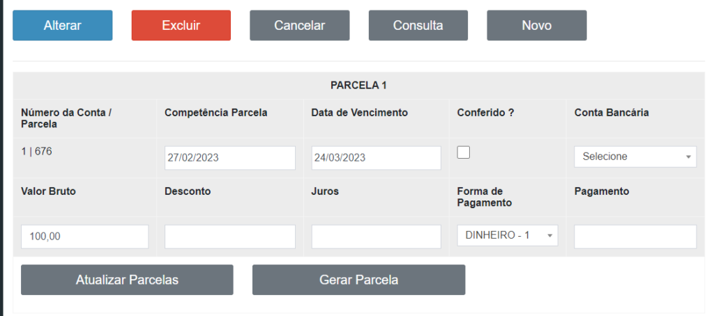 8°Passo: Para salvar todas as alterações, clique em "Alterar" e caso queira fazer alteração em alguma informação das parcelas, altere no campo desejado e clique em "Atualizar Parcelas":