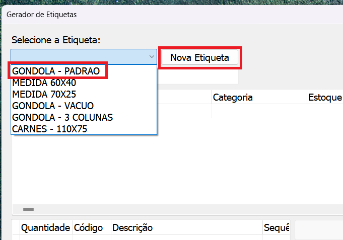 Observação: Geralmente é atribuído como "Gôndola", caso a sua etiqueta tenha dimensões diferentes, selecione o tamanho instruído pela equipe de suporte.