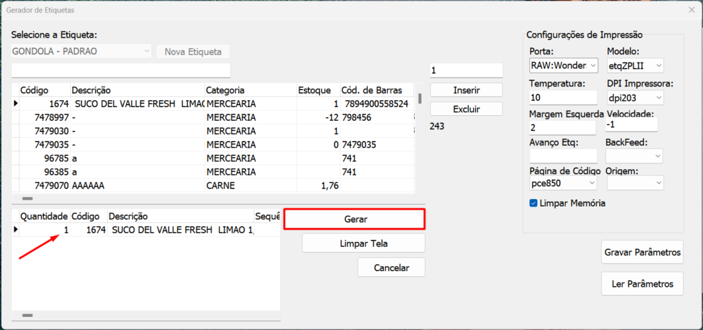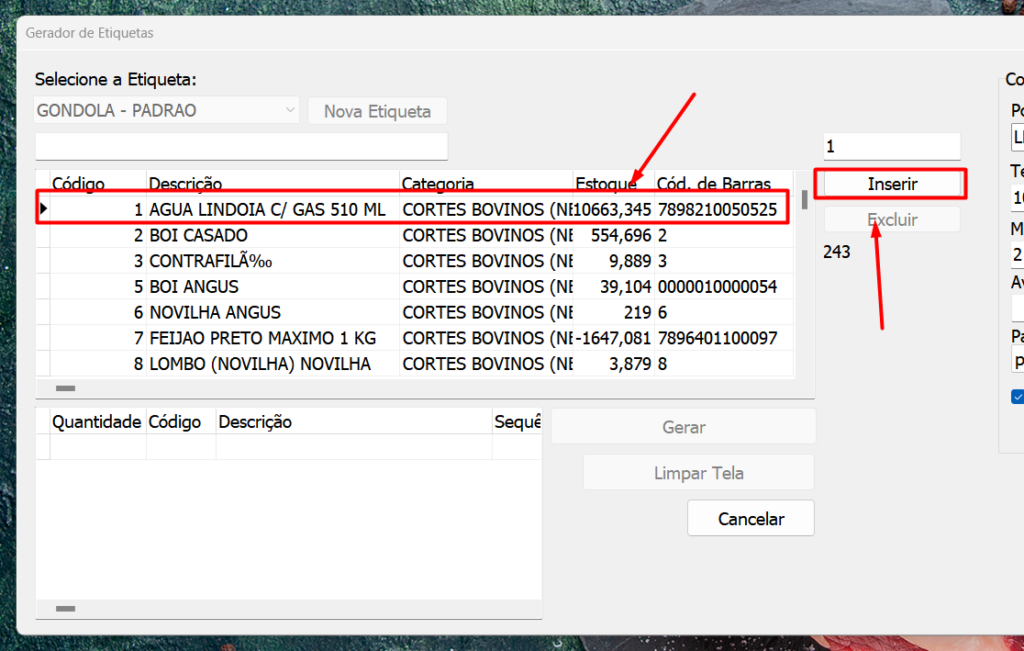 4º Passo: Localize os produtos que deseja emitir a etiqueta, pela tabela ou digite no campo em branco logo acima:
