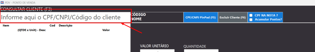 3º Passo: Caso o cliente não esteja cadastrado e seja somente um pedido de CPF na nota, dentro do campo "Informar Cliente", digite o CPF e clique em "Enter" no seu teclado: