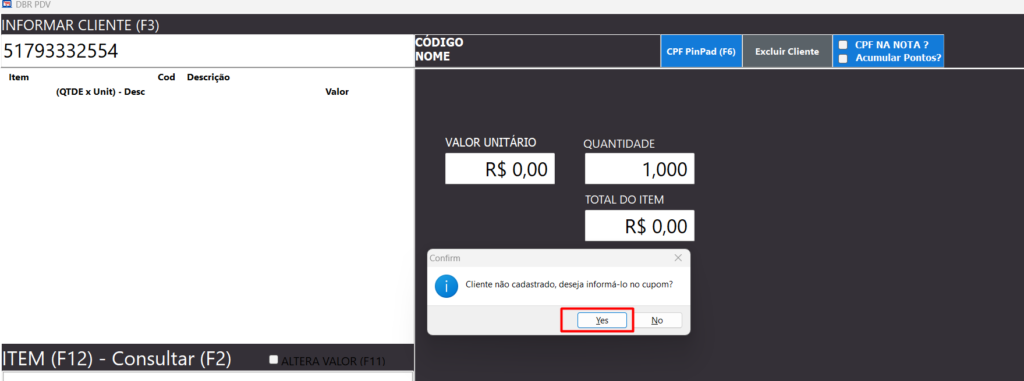 Como o cliente não é cadastrado irá aparecer a mensagem na tela, como na foto abaixo, clique em "Yes" ou "enter" no seu teclado e está feito! O CPF foi inserido!