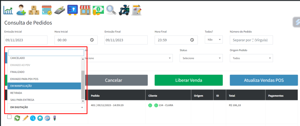 Dentro da página de "CONSULTA DE PEDIDOS", é possível acompanhar os pedidos e alterar o seu status: