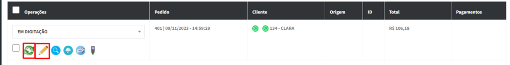 Lembre -se de a cada troca de status ou atualização do pedido, clique no ícone verde das setinhas e para voltar para a edição do pedido ou finalizar o pedido, clique no lápis ao lado: