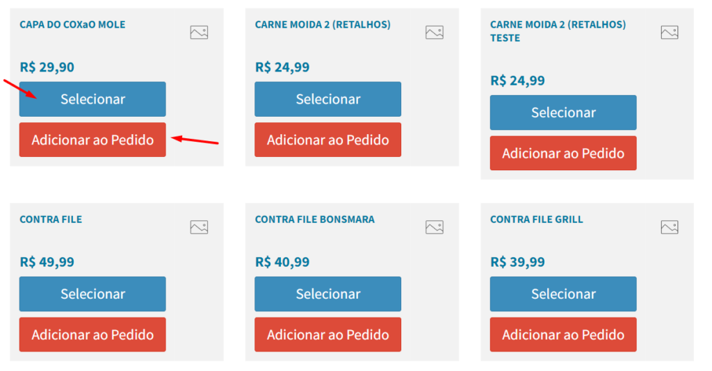 4º Passo: Dentro da categoria selecione os produtos , a opção em vermelho "ADICIONAR AO PEDIDO", insere o pedido da maneira em que ele está cadastrado, já o botão azul "SELECIONAR" te dá a opção de selecionar a quantidade do produto: