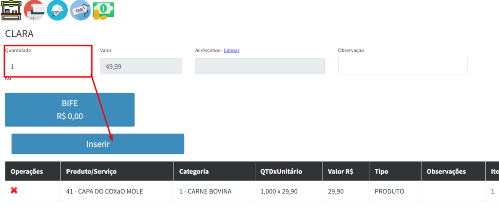 6º Passo: Nos ícones de "TAG", "GARÇON" e "IMPRESSORA" você consegue imprimir o pedido sem precisar finalizar a venda: