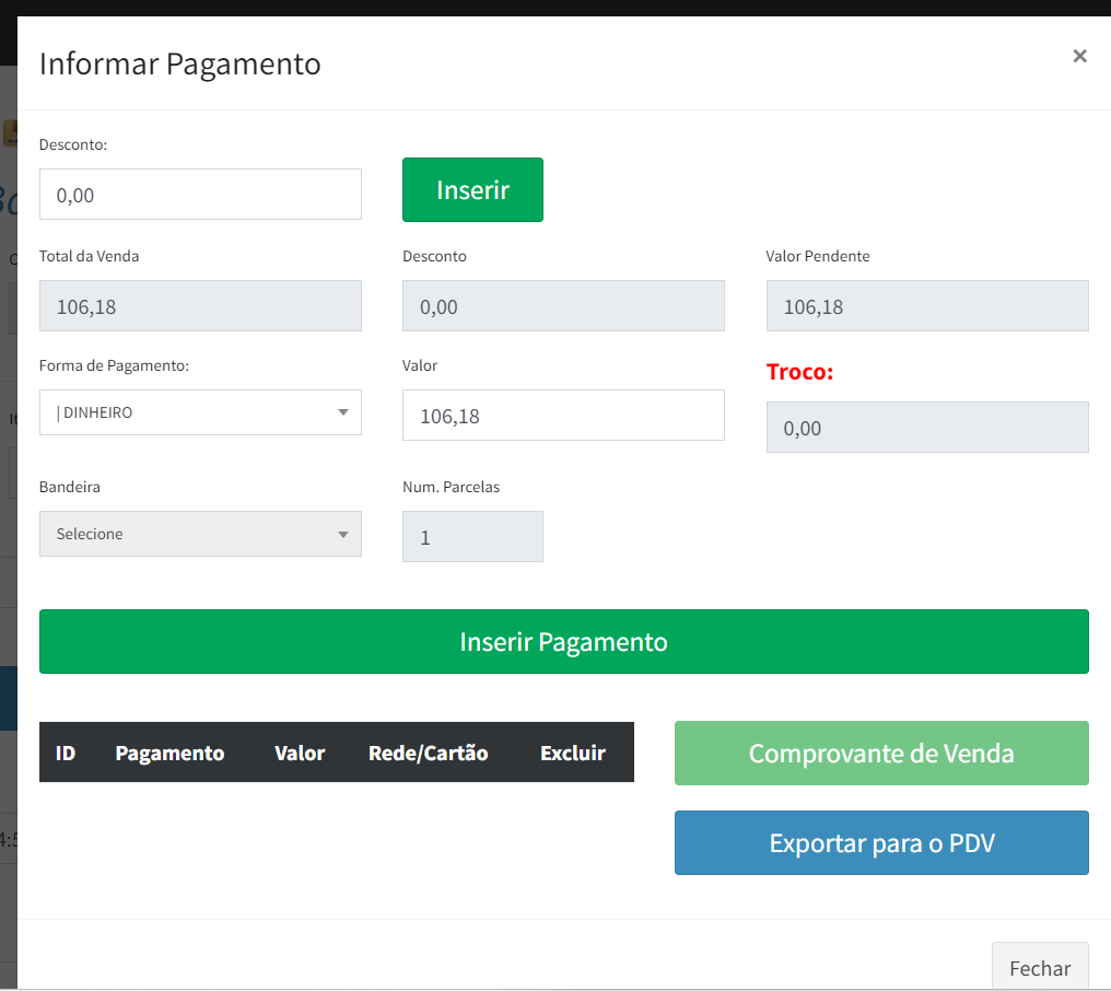 5º Passo: Após inserir todos os produtos, temos as opções de "Finalizar a Venda" no ícone dinheiro, que irá te encaminhar para tela de informar pagamento: