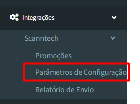 "Menu de Navegação" > "Integrações" > "Parâmetros Scanntech".