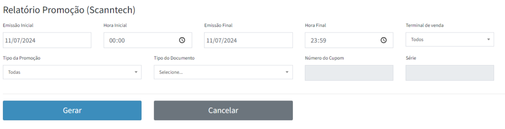 - Hora Final: Horário do final das promoções no período inserido na "emissão final" (opcional);