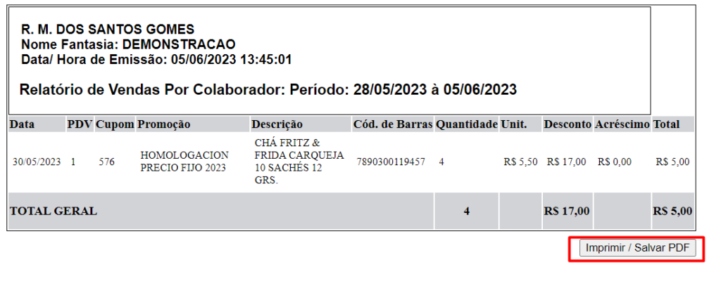 Segue um exemplo de como o relatório será emitido: