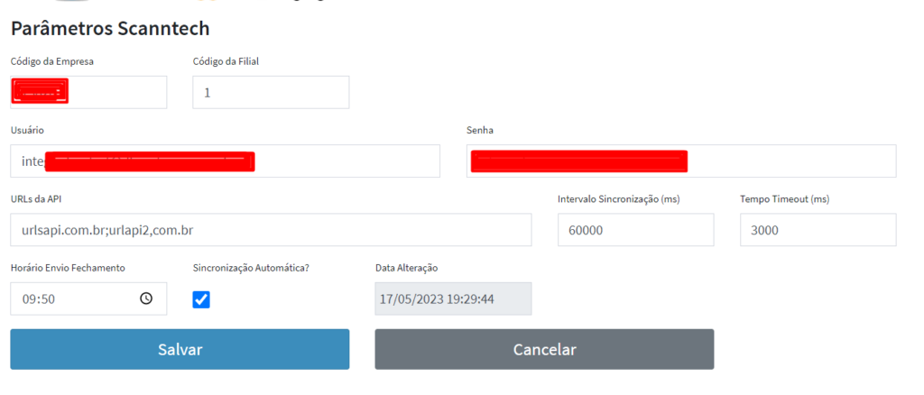 2.2.6) Intervalo Sincronização(ms): Selecionar um valor que será correspondente ao intervalo de tempo em segundos para comunicação entre o Integrador e a API da Scanntech;